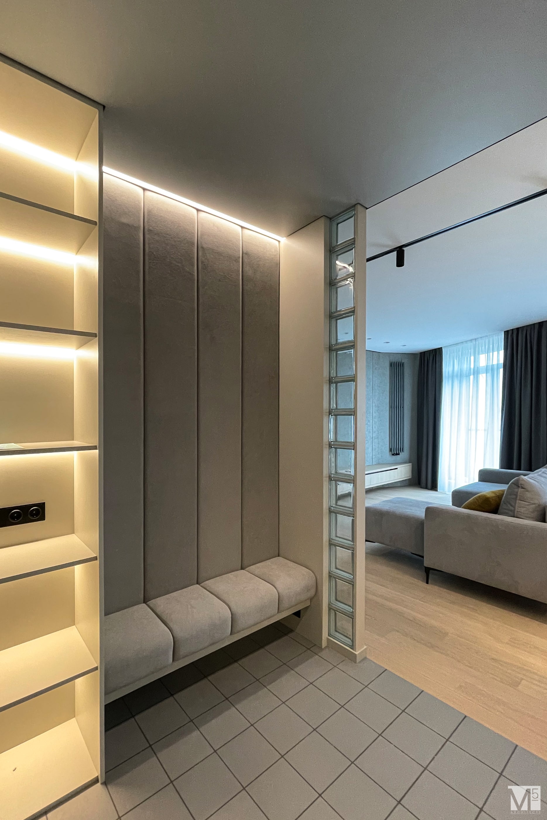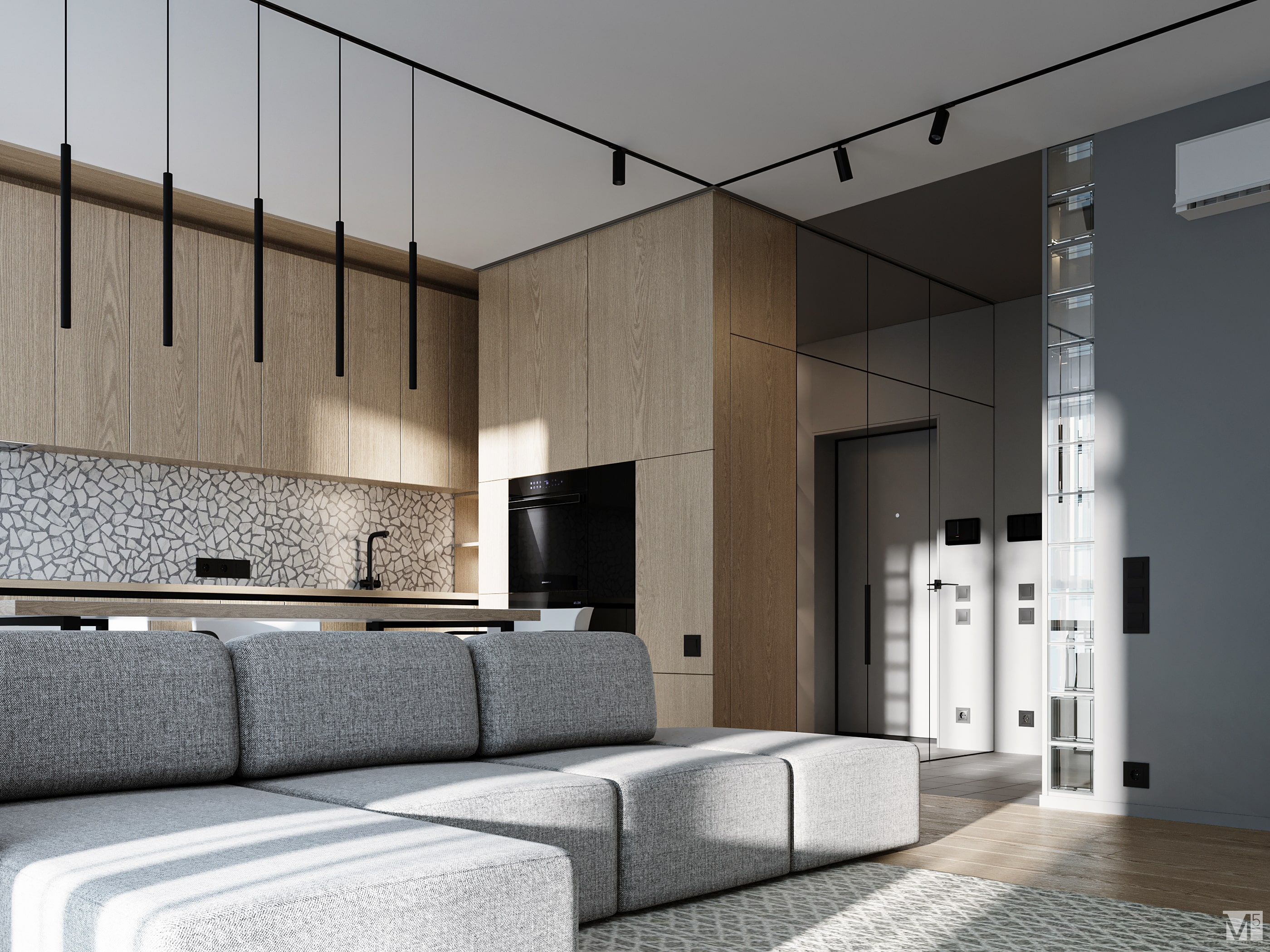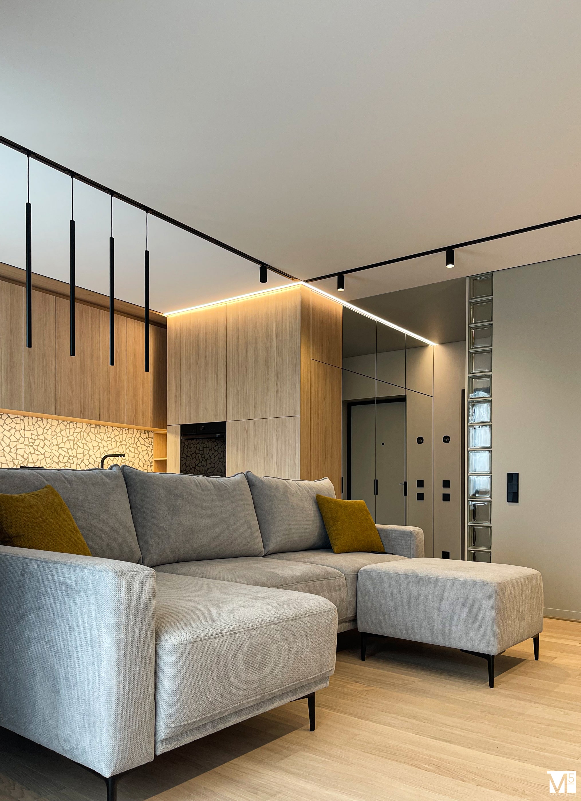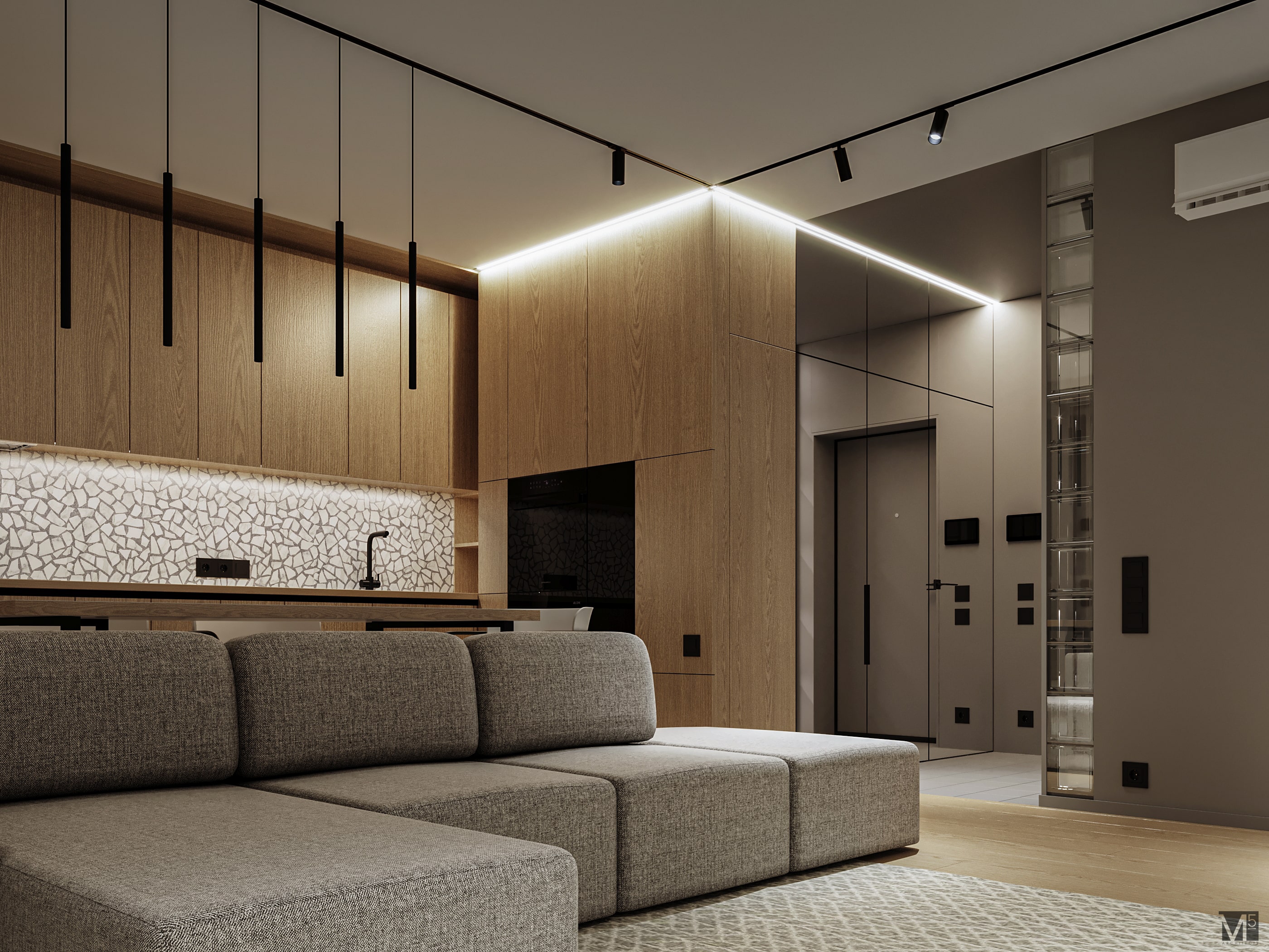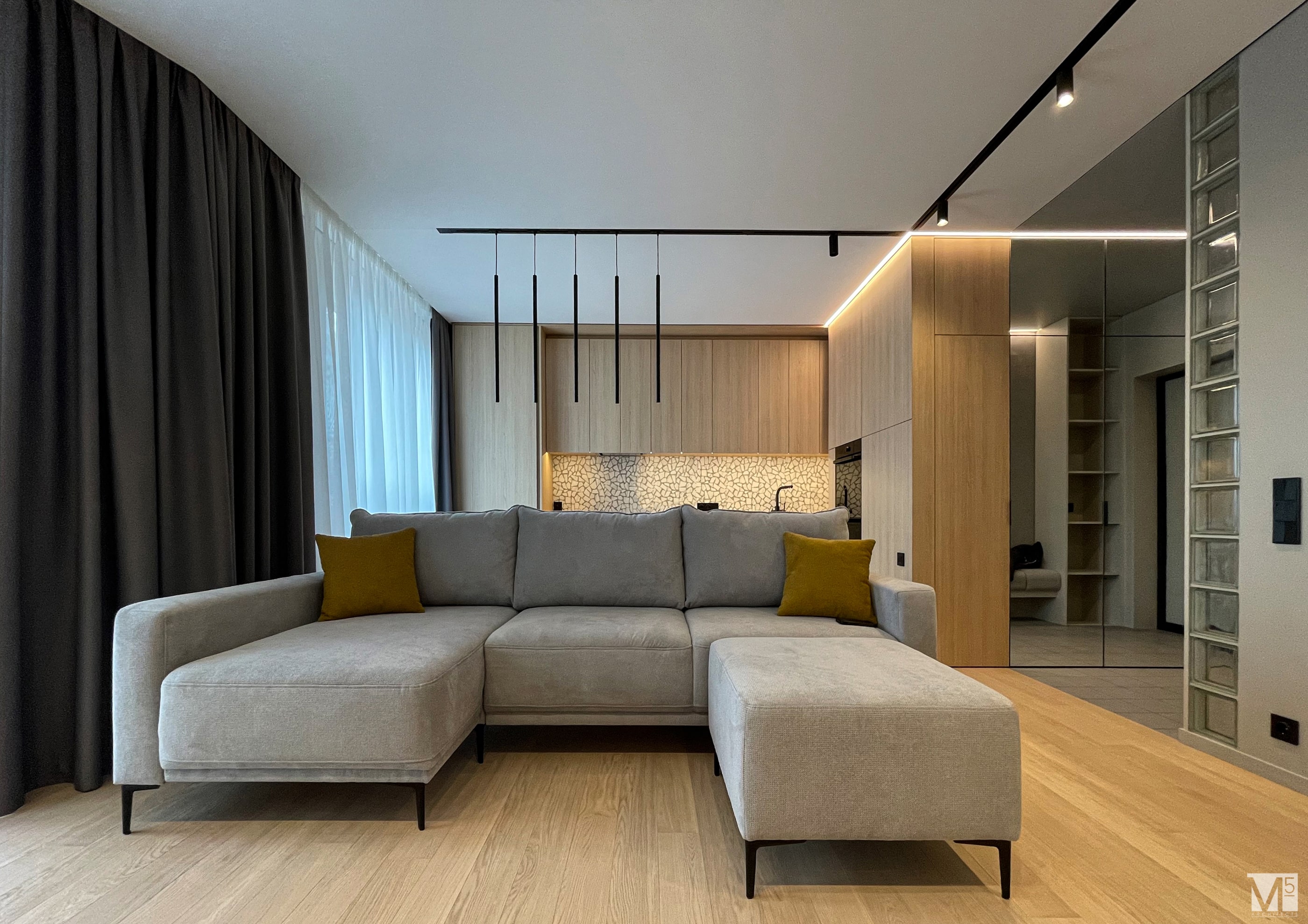 Эта квартира, площадью 62м2, была разработана для молодой пары, которая ценит простор, практичность, строгость и спокойствие. Именно эти ключевые слова и легли в основу этого проекта. Планировочное решение включает в себя: зону коридора, с большим зеркалом и всевозможными местами хранения, потайная постирочная с функцией кладовой, в которой спрятан весь силовой (электрический блок), большая гостиная совмещенная с кухней, спальня с гардеробом и небольшим рабочим местом, расположенным в лоджии. Теплая цветовая гамма обеспечивается приятной, соломенной, текстурой дерева в сочетании с серым и белыми цветами. Общую картину дополняют особые сценарии вечернего освещения, также продуманы места расположения всех электрических точек. Интерьер имеет ряд дизайнерских изюминок, которые акцентирую внимание. Это стеклянные блоки в переходной части из коридора в общую зону. Они же и пропускают свет. А еще были применены акустические панели в зоне ТВ. Это необычный, для квартир, материал имеющий практичное значение в вопросе акустического комфорта, к тому же очень оригинально выглядящий. Изголовье кровати, в спальне, решено из гипсовых 3Д панелей в сочетании с деревянными. В квартире присутствует много текстиля в виде штор, ковров и обивок мягкой мебели. Все выглядит светло, мягко и очень уютно.