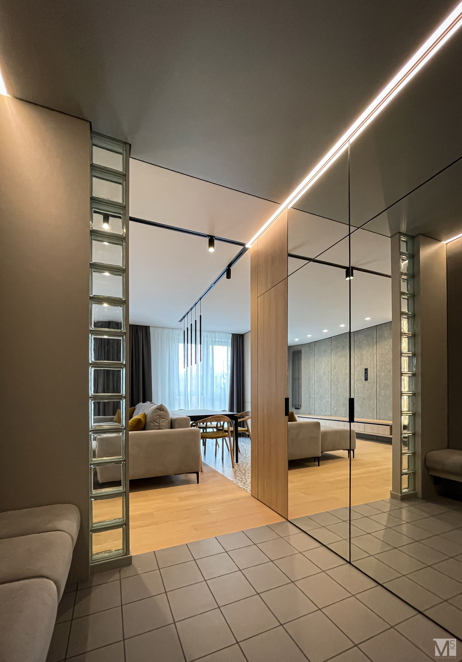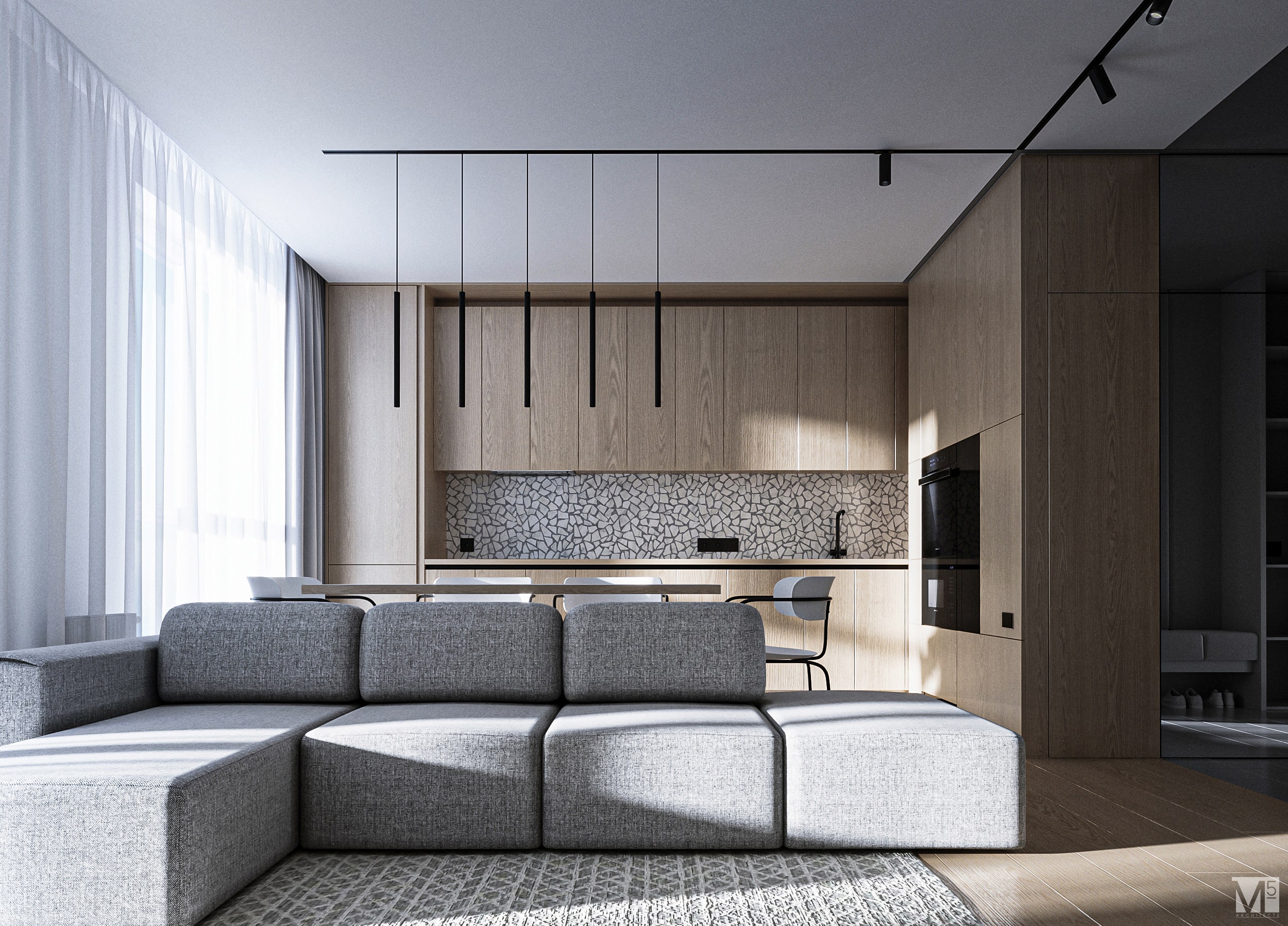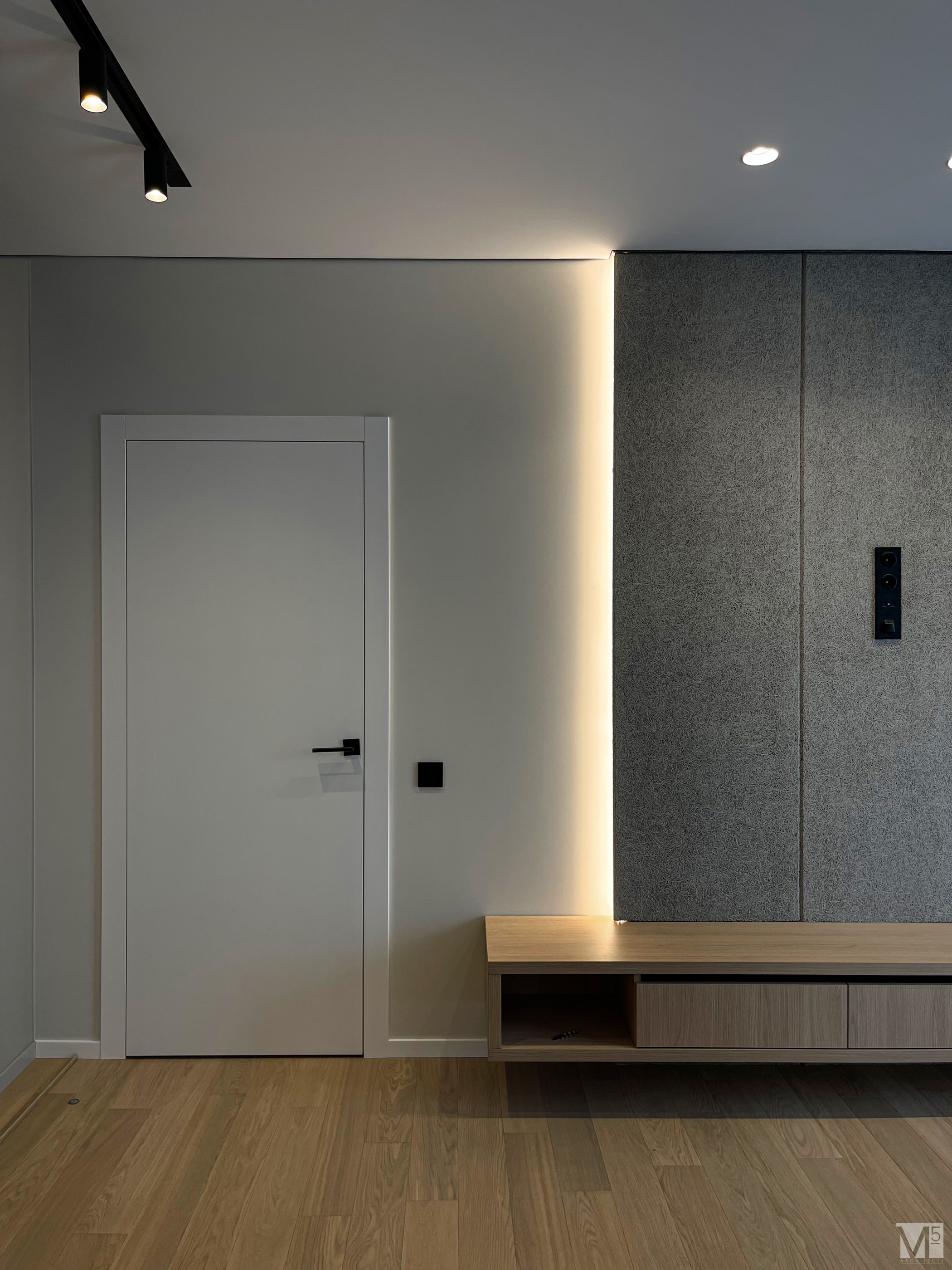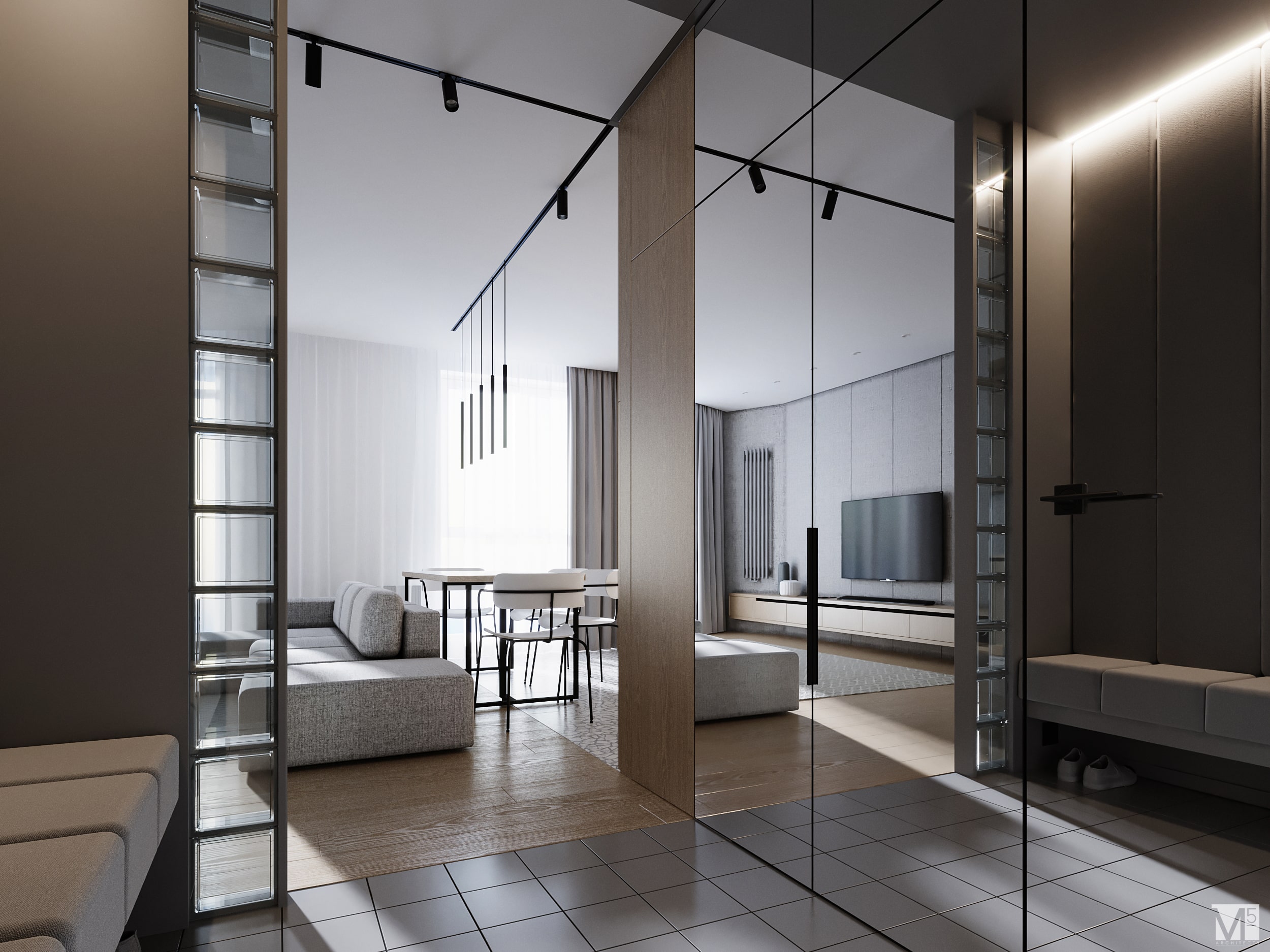 Эта квартира, площадью 62м2, была разработана для молодой пары, которая ценит простор, практичность, строгость и спокойствие. Именно эти ключевые слова и легли в основу этого проекта. Планировочное решение включает в себя: зону коридора, с большим зеркалом и всевозможными местами хранения, потайная постирочная с функцией кладовой, в которой спрятан весь силовой (электрический блок), большая гостиная совмещенная с кухней, спальня с гардеробом и небольшим рабочим местом, расположенным в лоджии. Теплая цветовая гамма обеспечивается приятной, соломенной, текстурой дерева в сочетании с серым и белыми цветами. Общую картину дополняют особые сценарии вечернего освещения, также продуманы места расположения всех электрических точек. Интерьер имеет ряд дизайнерских изюминок, которые акцентирую внимание. Это стеклянные блоки в переходной части из коридора в общую зону. Они же и пропускают свет. А еще были применены акустические панели в зоне ТВ. Это необычный, для квартир, материал имеющий практичное значение в вопросе акустического комфорта, к тому же очень оригинально выглядящий. Изголовье кровати, в спальне, решено из гипсовых 3Д панелей в сочетании с деревянными. В квартире присутствует много текстиля в виде штор, ковров и обивок мягкой мебели. Все выглядит светло, мягко и очень уютно.