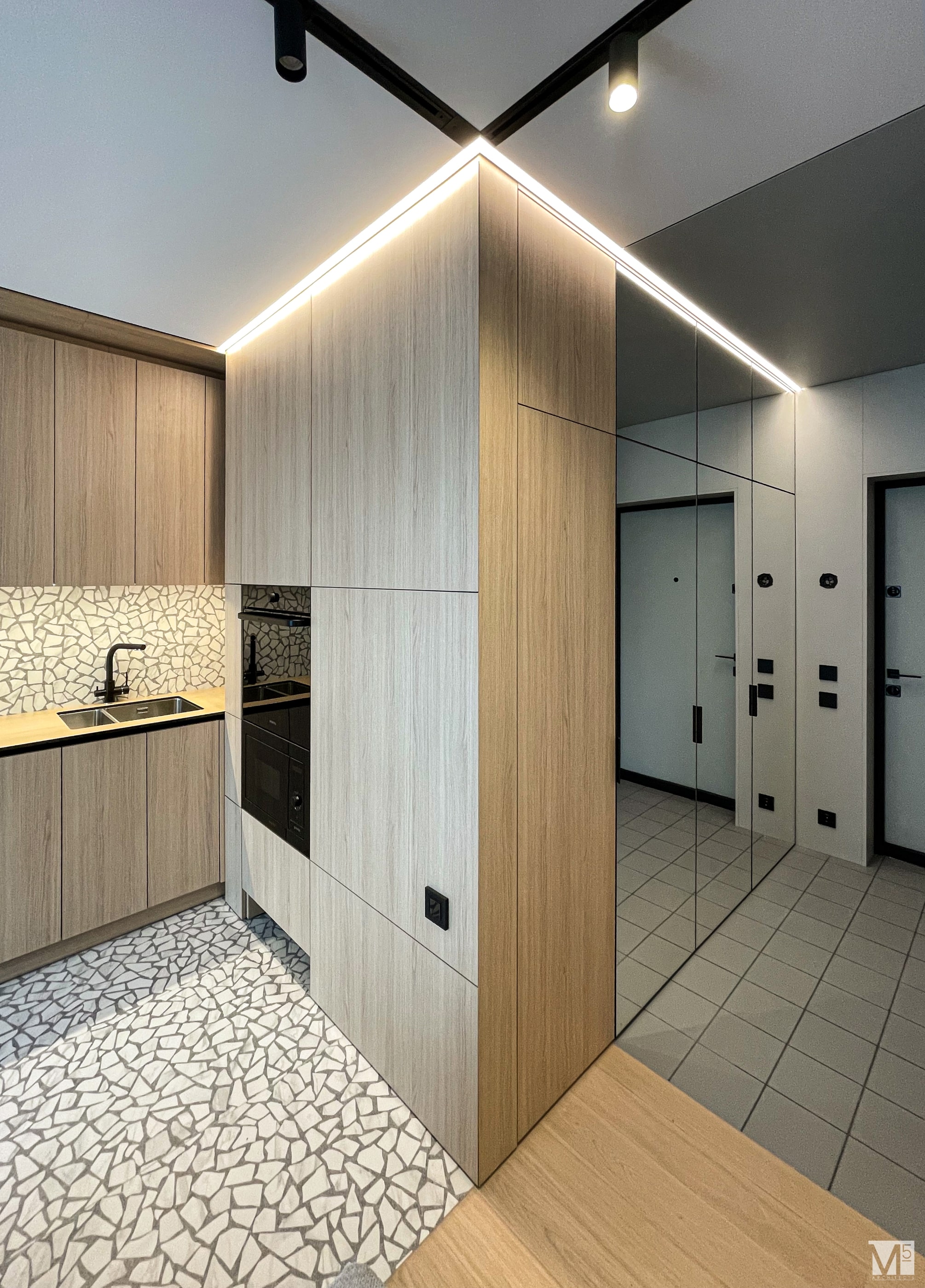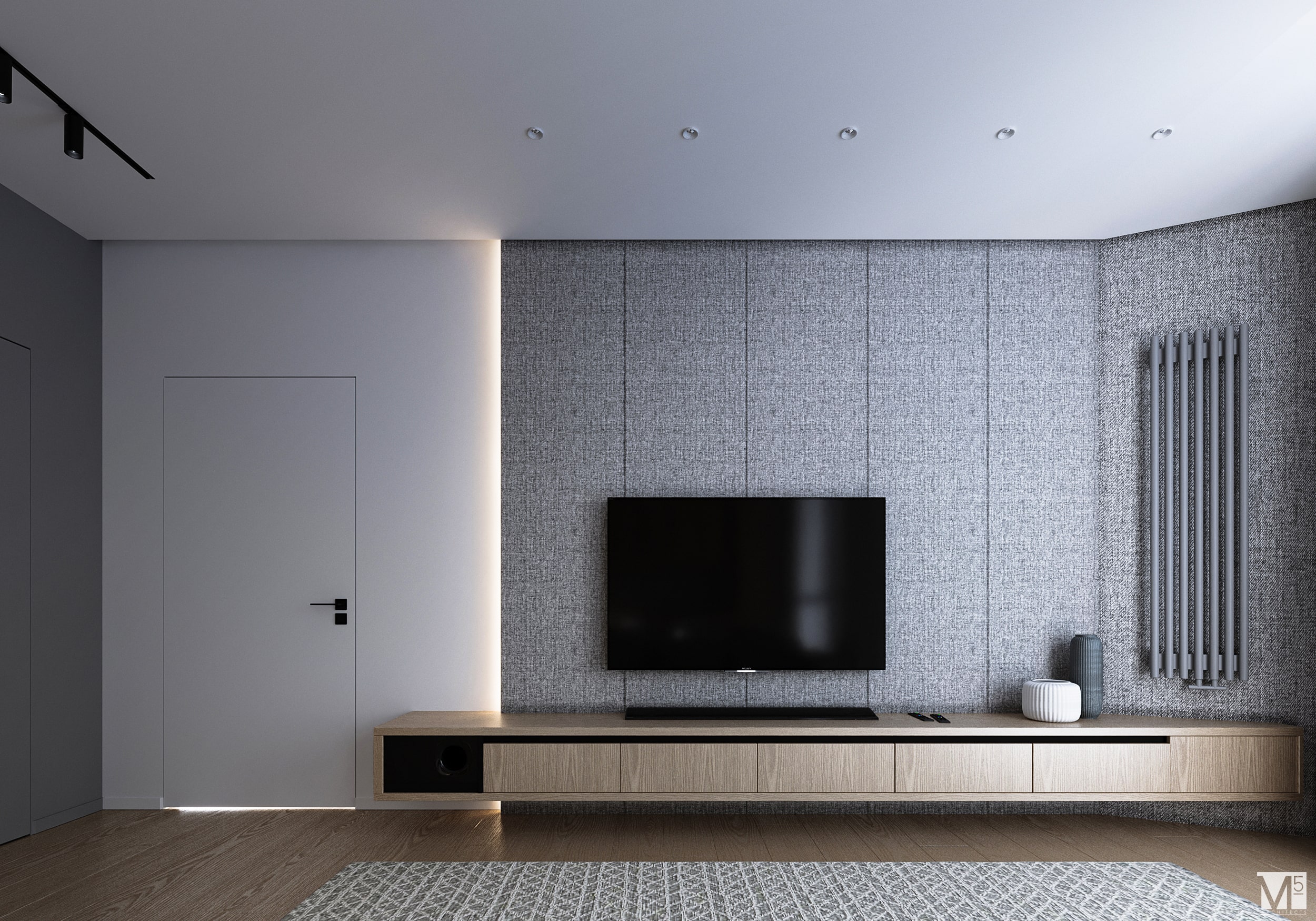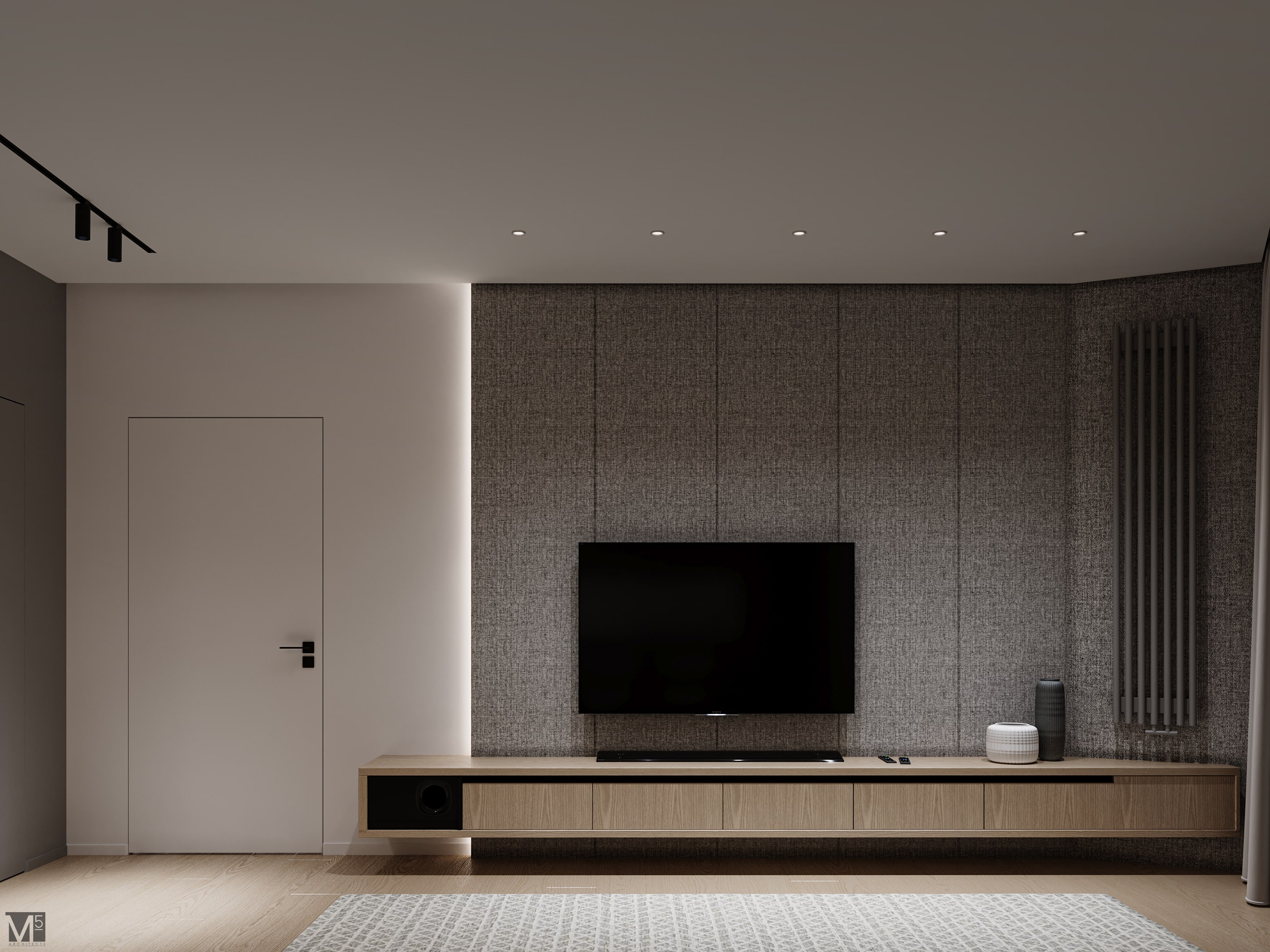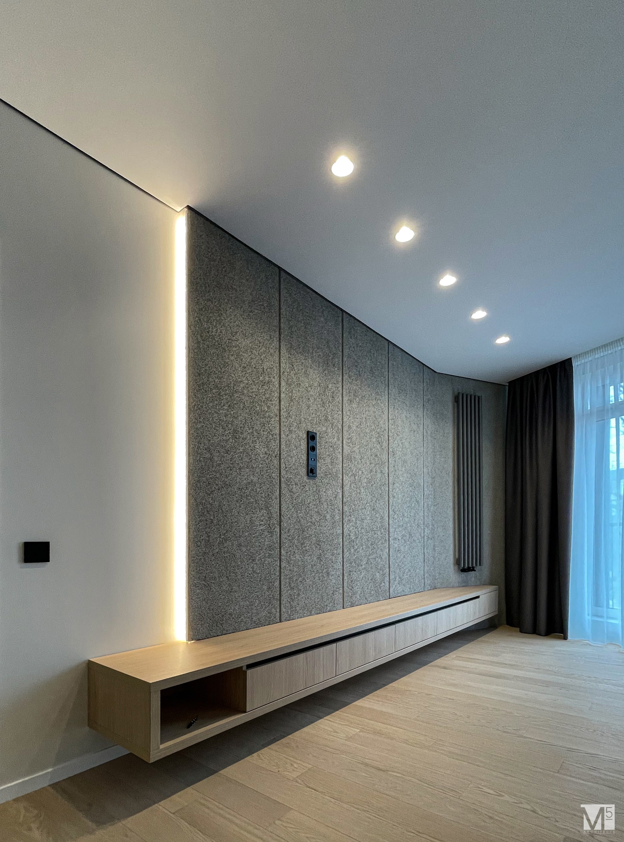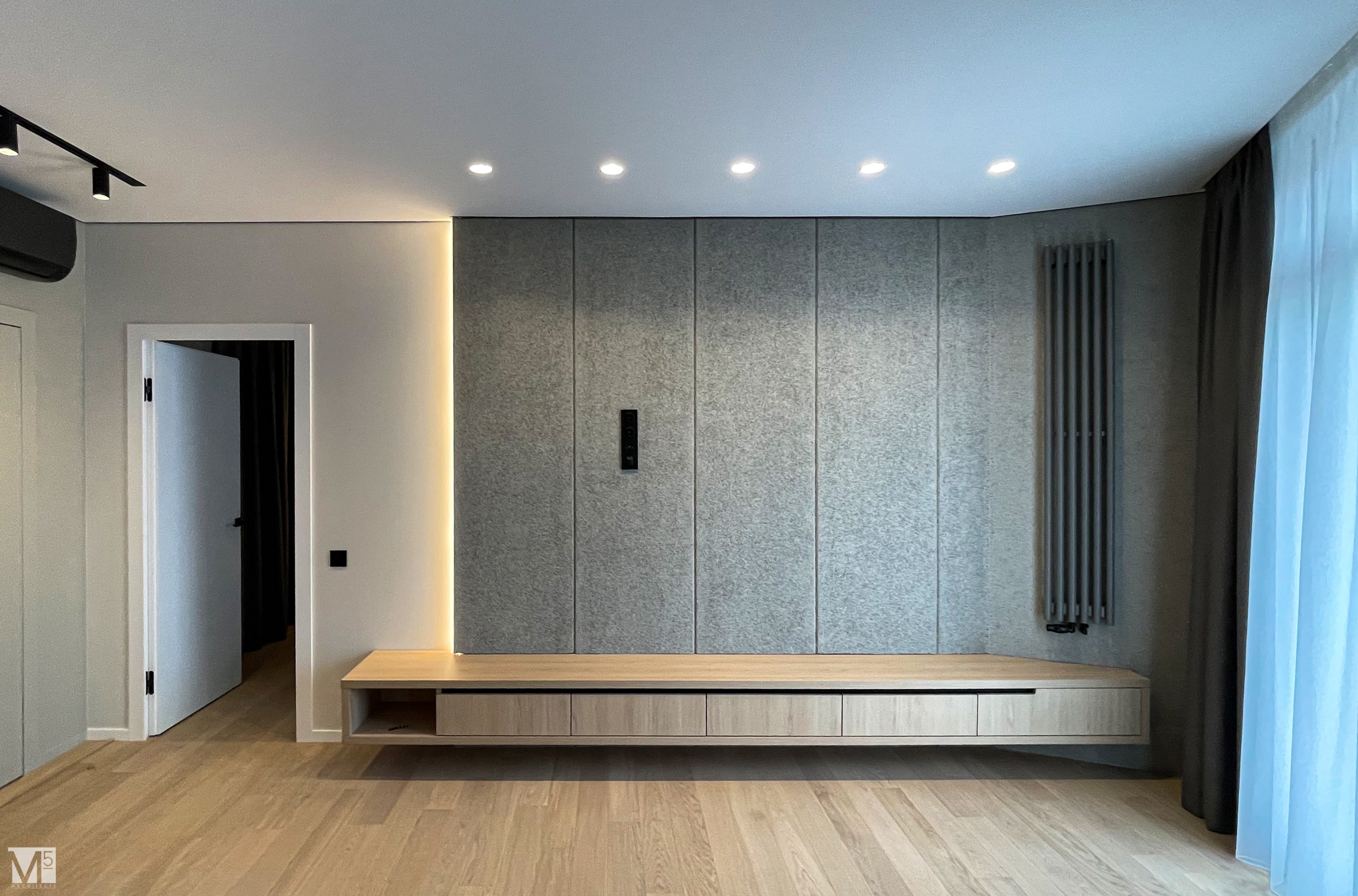 Эта квартира, площадью 62м2, была разработана для молодой пары, которая ценит простор, практичность, строгость и спокойствие. Именно эти ключевые слова и легли в основу этого проекта. Планировочное решение включает в себя: зону коридора, с большим зеркалом и всевозможными местами хранения, потайная постирочная с функцией кладовой, в которой спрятан весь силовой (электрический блок), большая гостиная совмещенная с кухней, спальня с гардеробом и небольшим рабочим местом, расположенным в лоджии. Теплая цветовая гамма обеспечивается приятной, соломенной, текстурой дерева в сочетании с серым и белыми цветами. Общую картину дополняют особые сценарии вечернего освещения, также продуманы места расположения всех электрических точек. Интерьер имеет ряд дизайнерских изюминок, которые акцентирую внимание. Это стеклянные блоки в переходной части из коридора в общую зону. Они же и пропускают свет. А еще были применены акустические панели в зоне ТВ. Это необычный, для квартир, материал имеющий практичное значение в вопросе акустического комфорта, к тому же очень оригинально выглядящий. Изголовье кровати, в спальне, решено из гипсовых 3Д панелей в сочетании с деревянными. В квартире присутствует много текстиля в виде штор, ковров и обивок мягкой мебели. Все выглядит светло, мягко и очень уютно.
