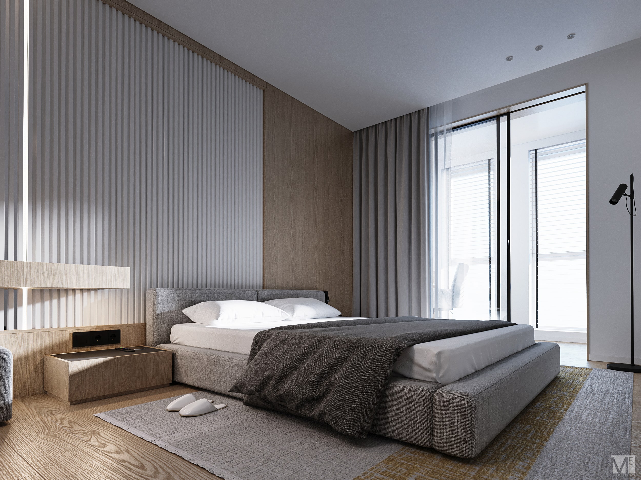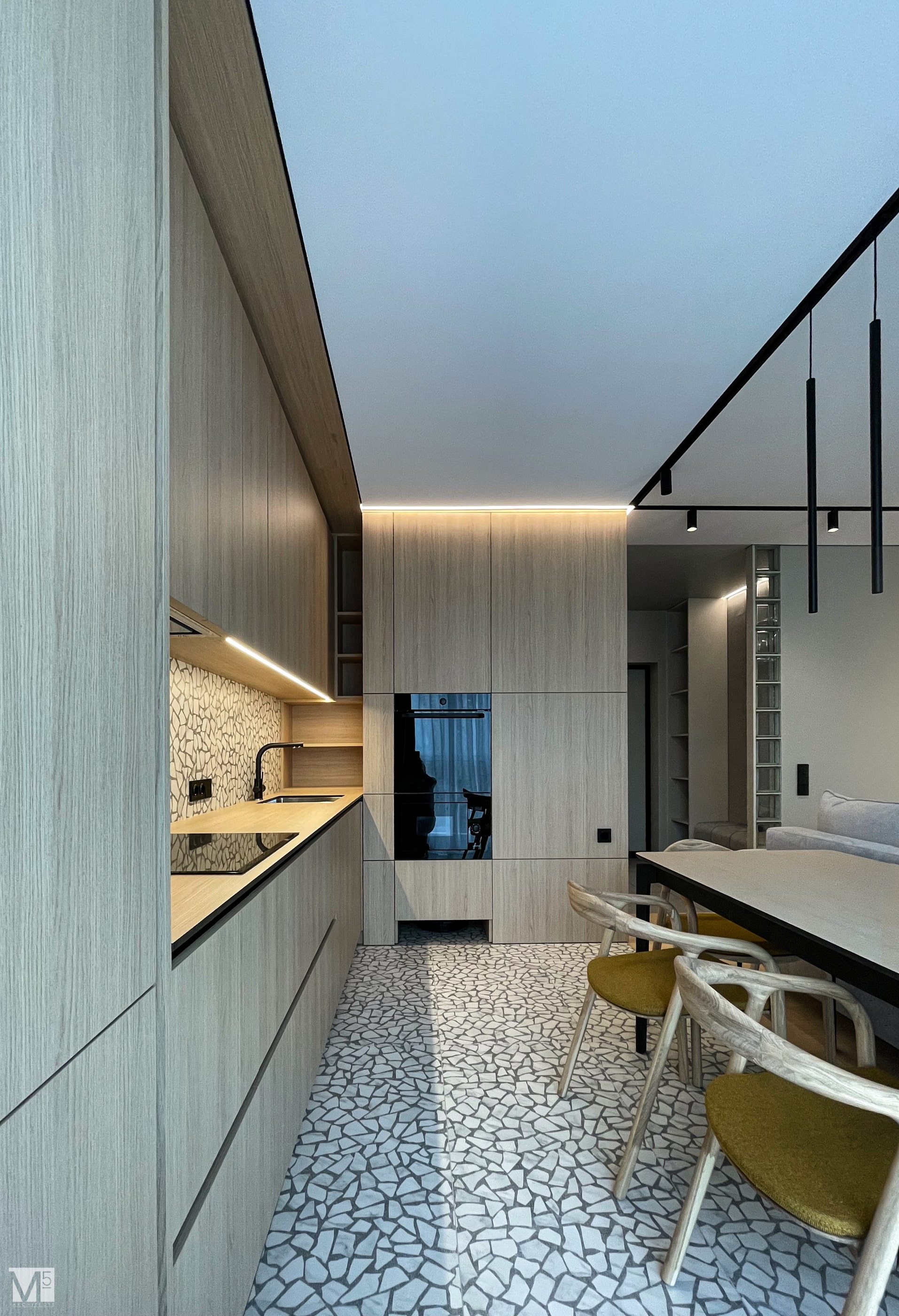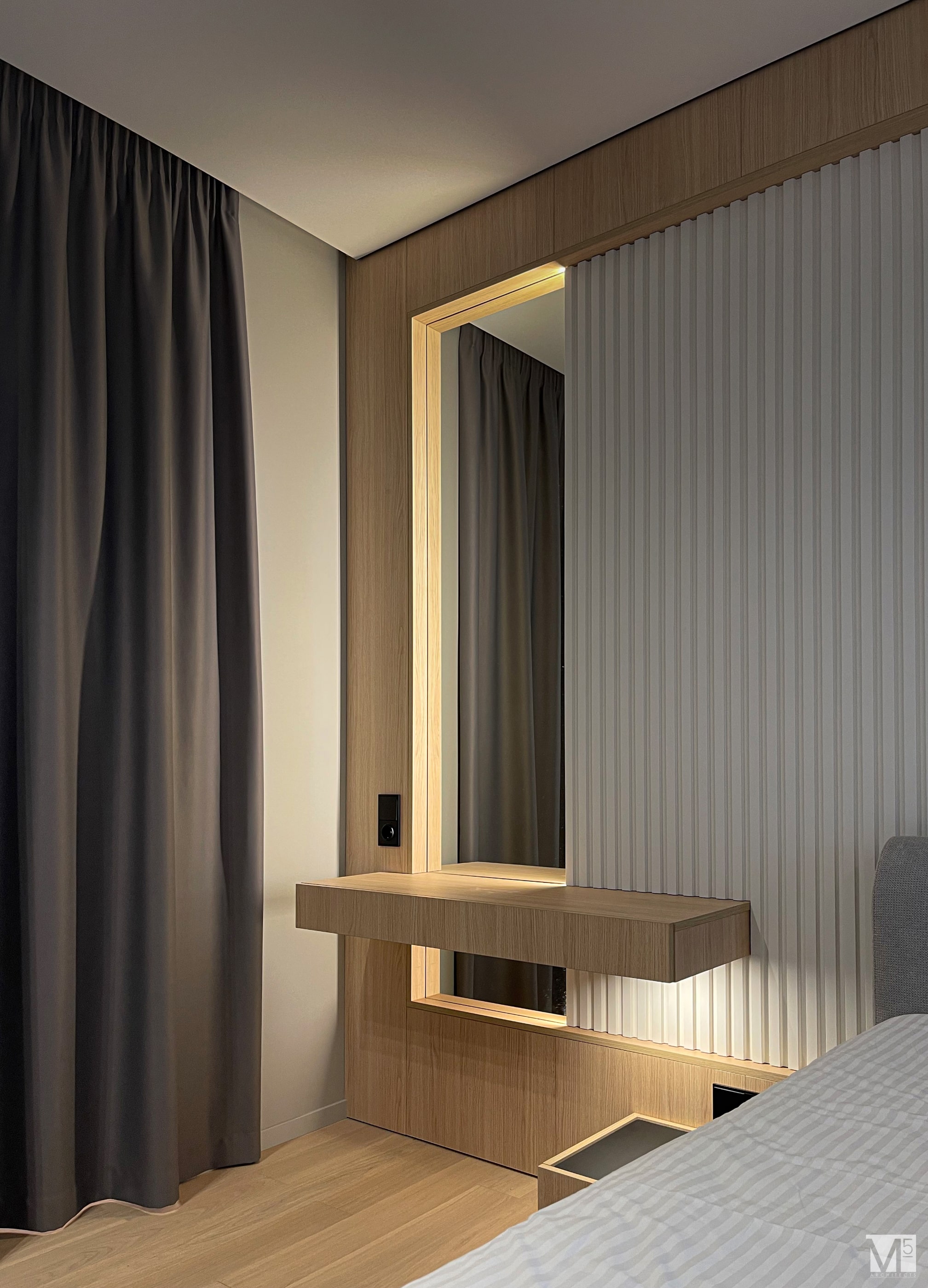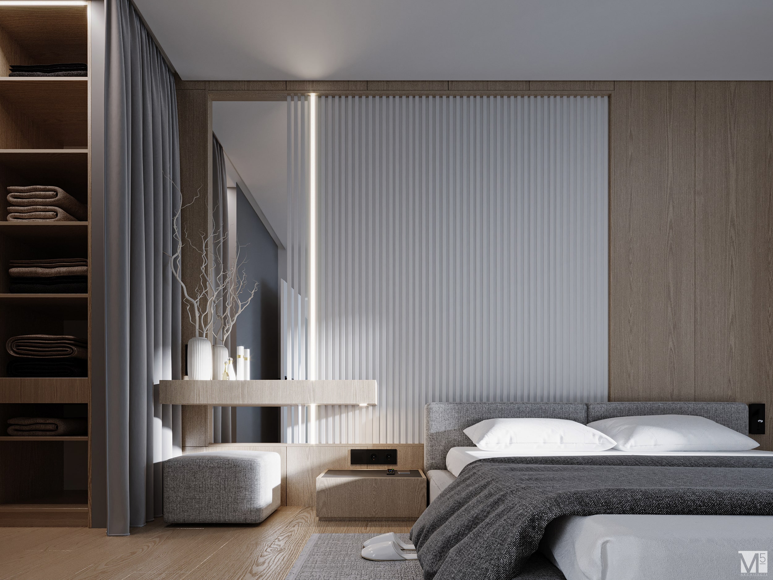Эта квартира, площадью 62м2, была разработана для молодой пары, которая ценит простор, практичность, строгость и спокойствие. Именно эти ключевые слова и легли в основу этого проекта. Планировочное решение включает в себя: зону коридора, с большим зеркалом и всевозможными местами хранения, потайная постирочная с функцией кладовой, в которой спрятан весь силовой (электрический блок), большая гостиная совмещенная с кухней, спальня с гардеробом и небольшим рабочим местом, расположенным в лоджии. Теплая цветовая гамма обеспечивается приятной, соломенной, текстурой дерева в сочетании с серым и белыми цветами. Общую картину дополняют особые сценарии вечернего освещения, также продуманы места расположения всех электрических точек. Интерьер имеет ряд дизайнерских изюминок, которые акцентирую внимание. Это стеклянные блоки в переходной части из коридора в общую зону. Они же и пропускают свет. А еще были применены акустические панели в зоне ТВ. Это необычный, для квартир, материал имеющий практичное значение в вопросе акустического комфорта, к тому же очень оригинально выглядящий. Изголовье кровати, в спальне, решено из гипсовых 3Д панелей в сочетании с деревянными. В квартире присутствует много текстиля в виде штор, ковров и обивок мягкой мебели. Все выглядит светло, мягко и очень уютно.