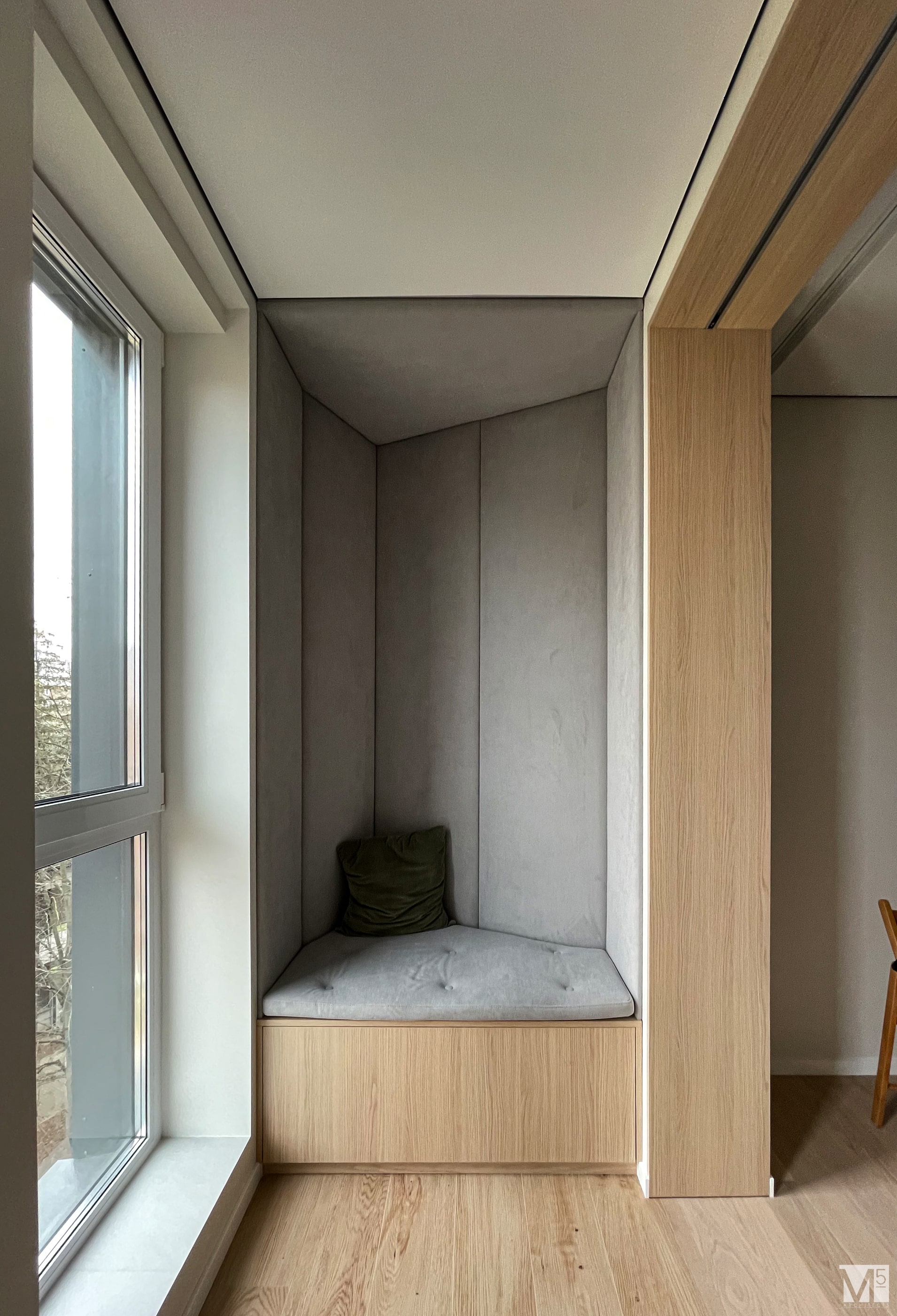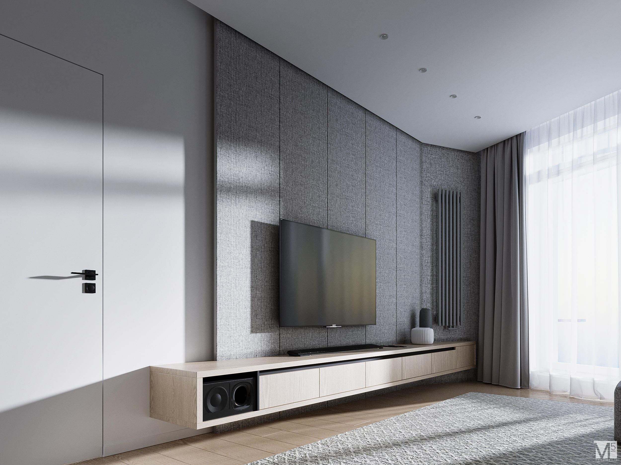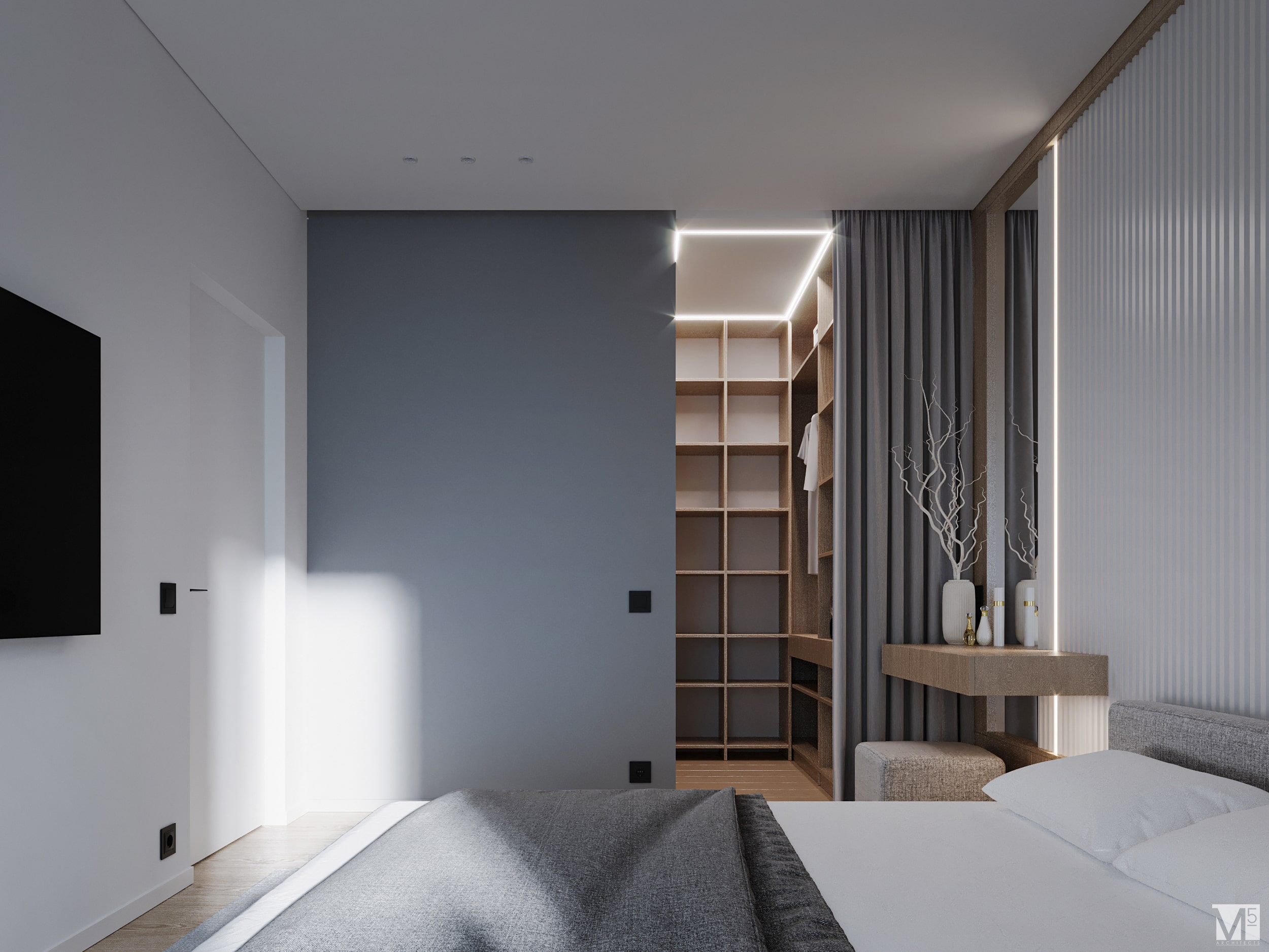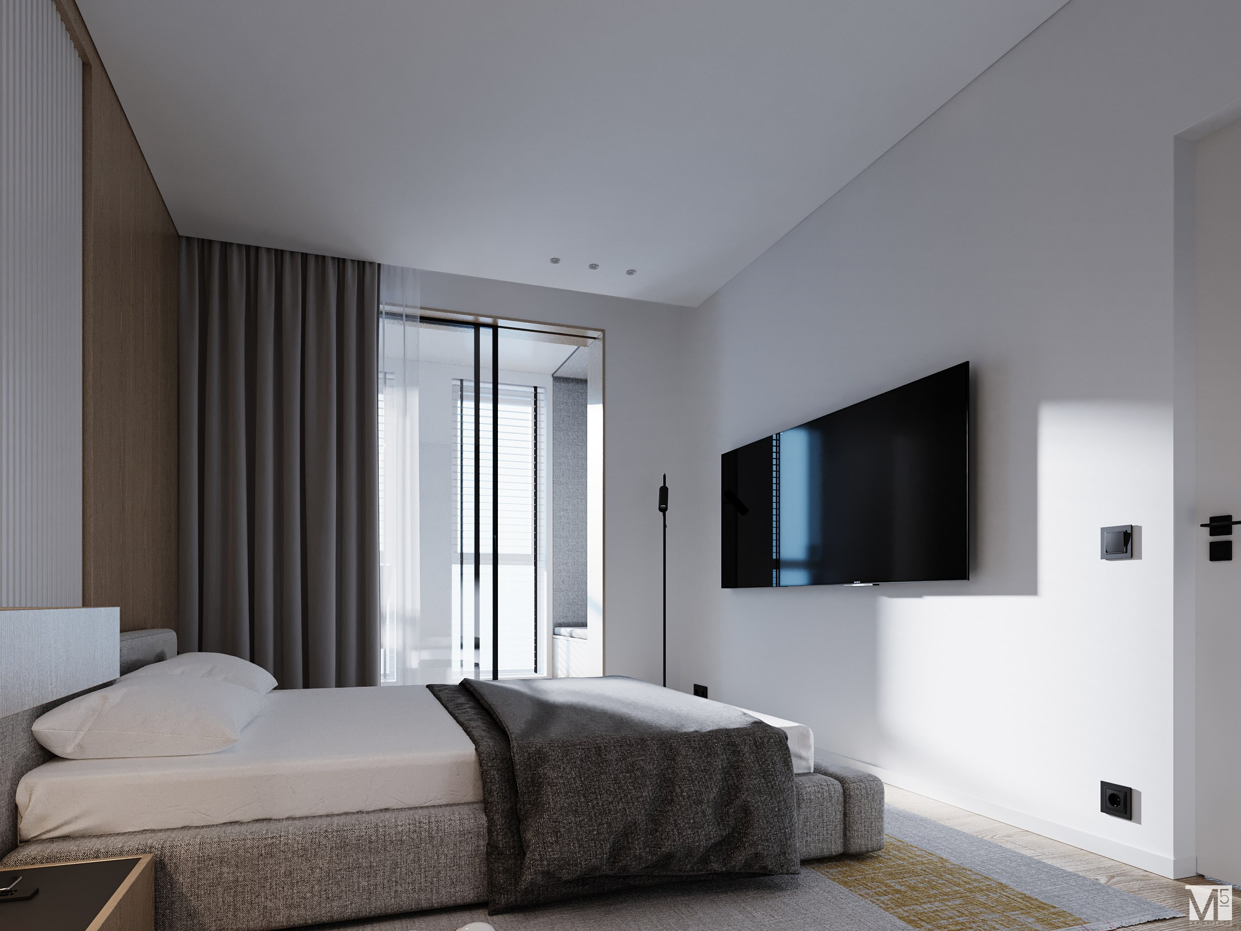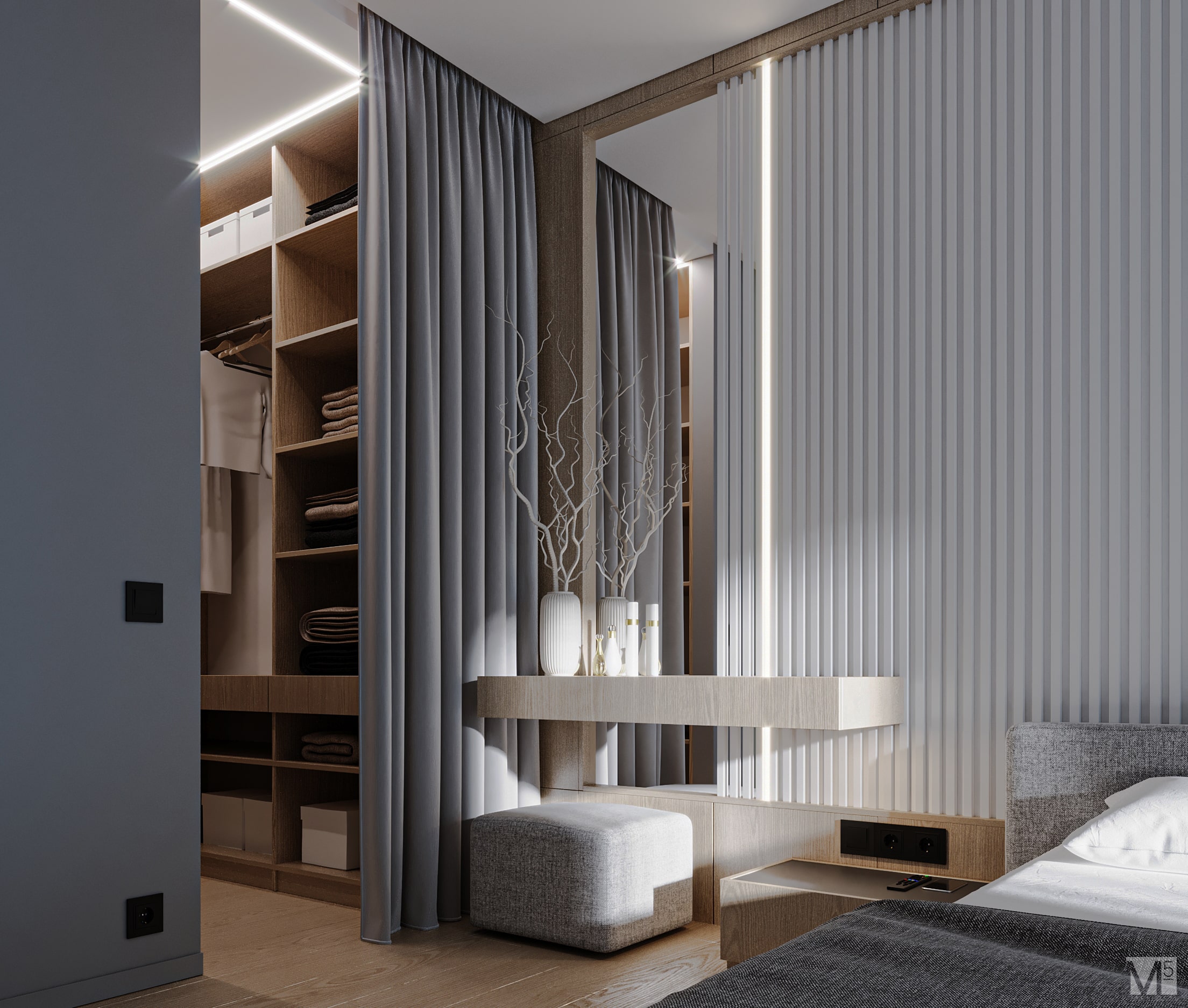 Эта квартира, площадью 62м2, была разработана для молодой пары, которая ценит простор, практичность, строгость и спокойствие. Именно эти ключевые слова и легли в основу этого проекта. Планировочное решение включает в себя: зону коридора, с большим зеркалом и всевозможными местами хранения, потайная постирочная с функцией кладовой, в которой спрятан весь силовой (электрический блок), большая гостиная совмещенная с кухней, спальня с гардеробом и небольшим рабочим местом, расположенным в лоджии. Теплая цветовая гамма обеспечивается приятной, соломенной, текстурой дерева в сочетании с серым и белыми цветами. Общую картину дополняют особые сценарии вечернего освещения, также продуманы места расположения всех электрических точек. Интерьер имеет ряд дизайнерских изюминок, которые акцентирую внимание. Это стеклянные блоки в переходной части из коридора в общую зону. Они же и пропускают свет. А еще были применены акустические панели в зоне ТВ. Это необычный, для квартир, материал имеющий практичное значение в вопросе акустического комфорта, к тому же очень оригинально выглядящий. Изголовье кровати, в спальне, решено из гипсовых 3Д панелей в сочетании с деревянными. В квартире присутствует много текстиля в виде штор, ковров и обивок мягкой мебели. Все выглядит светло, мягко и очень уютно.