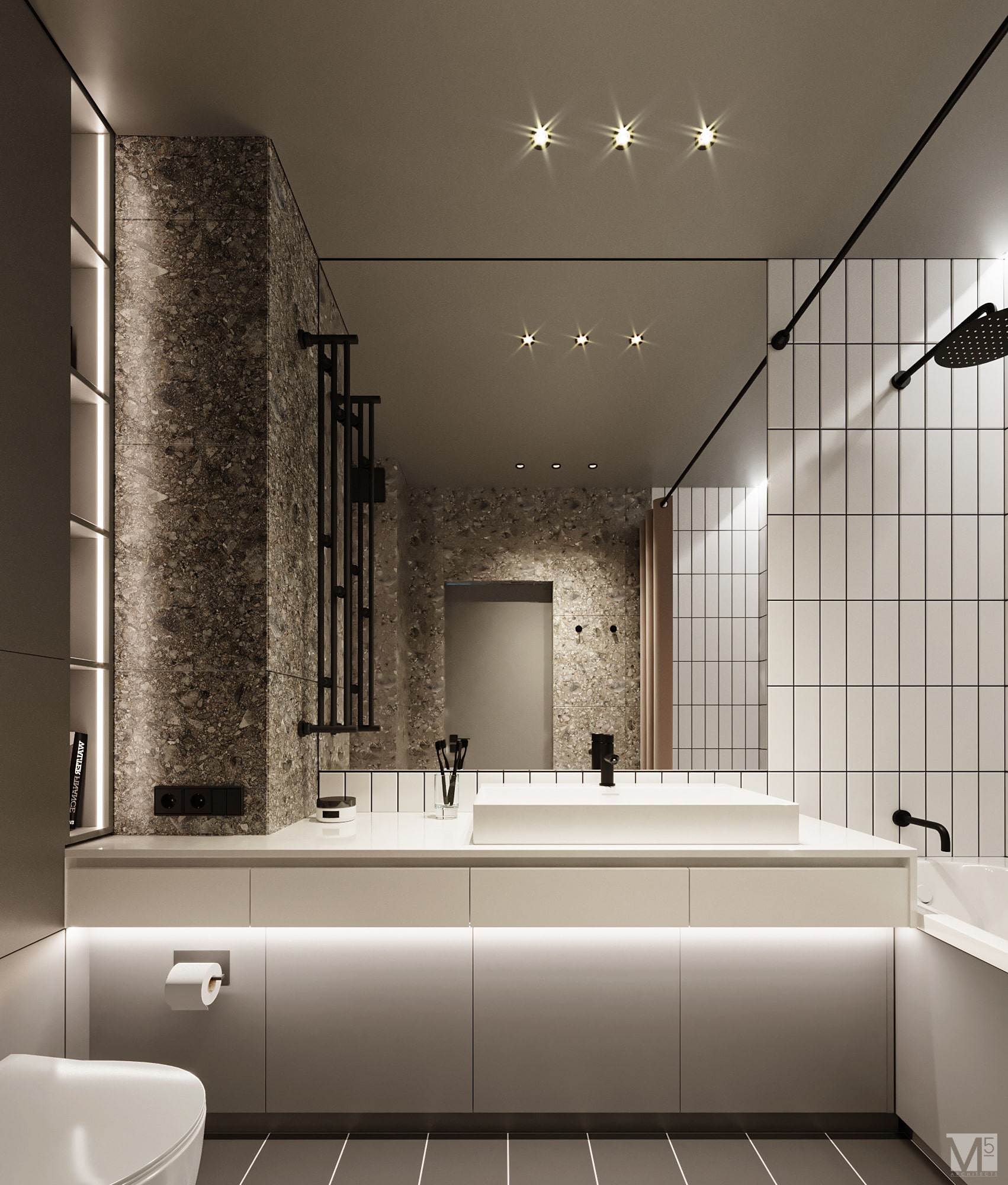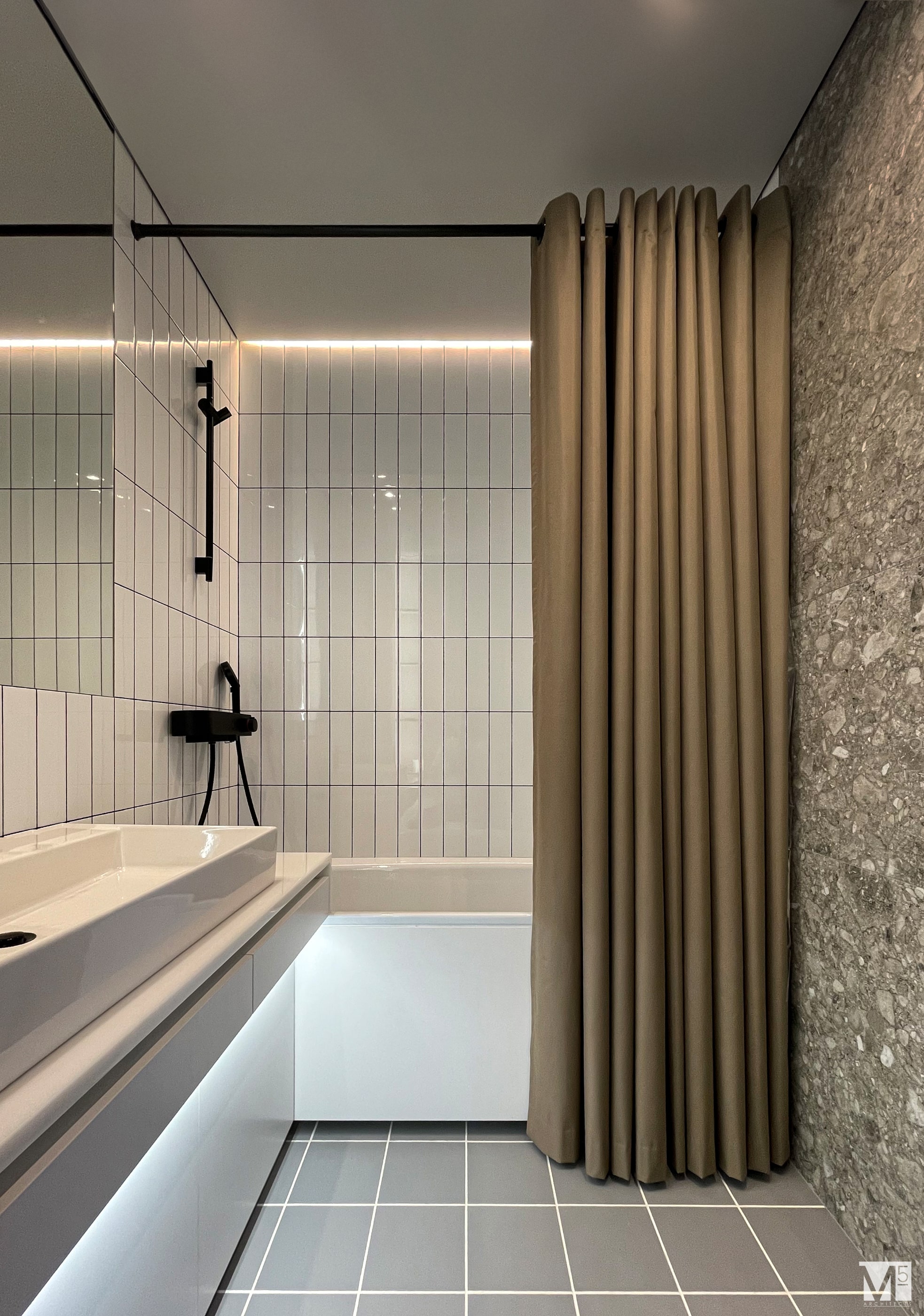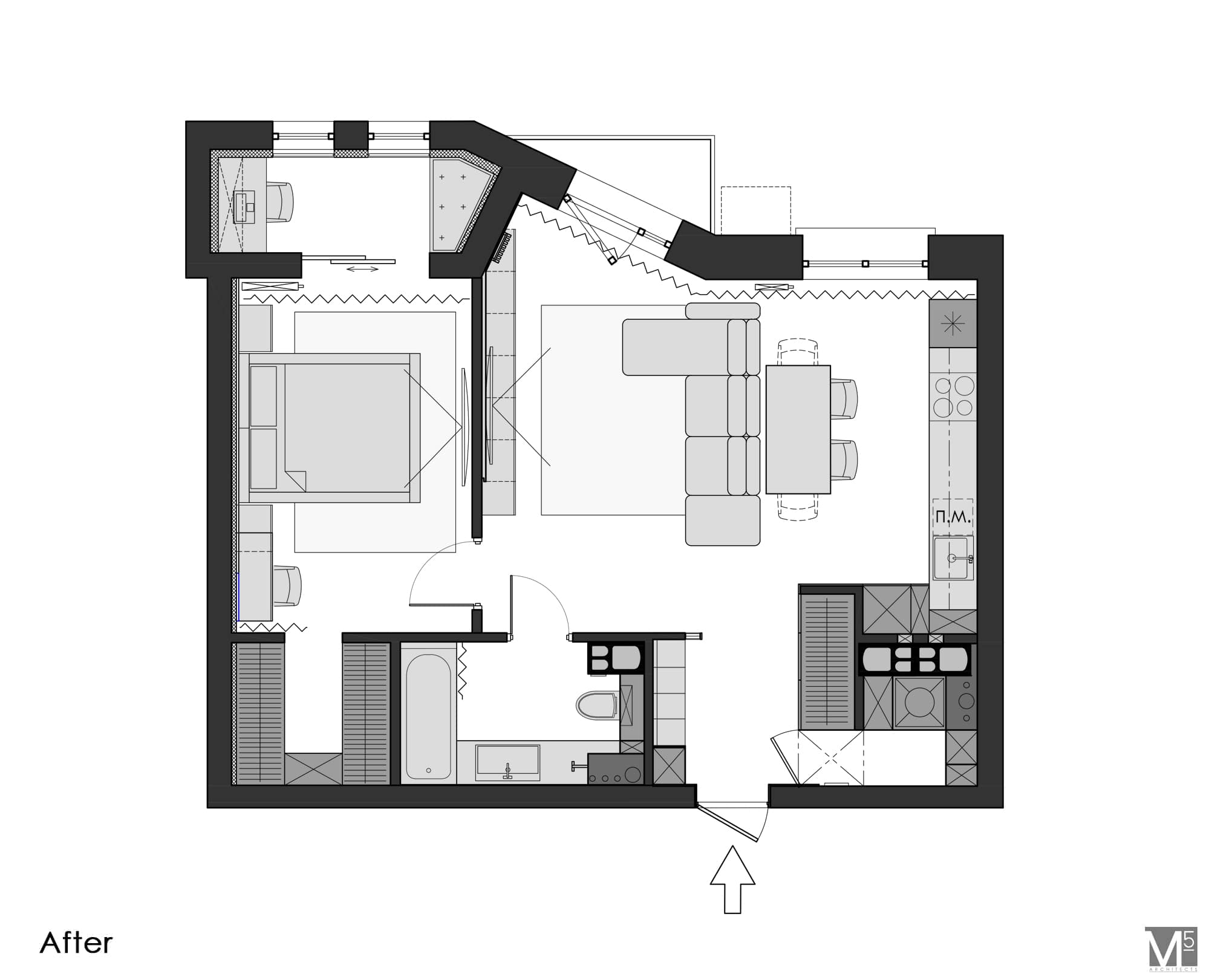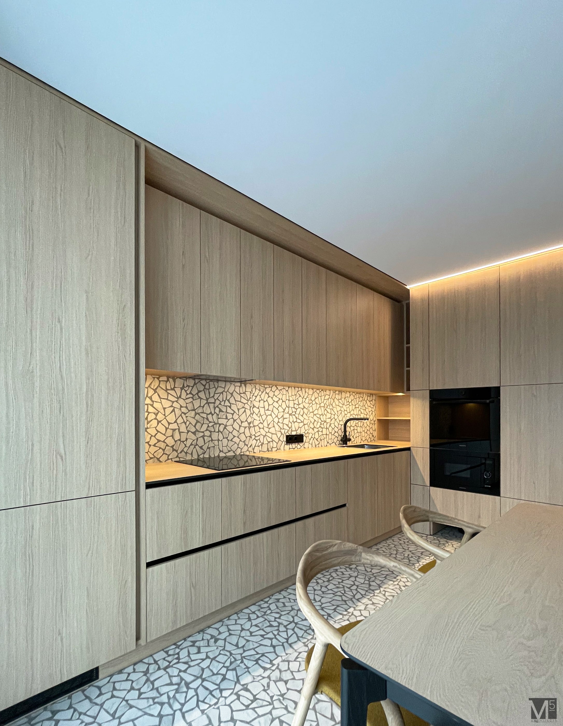 Эта квартира, площадью 62м2, была разработана для молодой пары, которая ценит простор, практичность, строгость и спокойствие. Именно эти ключевые слова и легли в основу этого проекта. Планировочное решение включает в себя: зону коридора, с большим зеркалом и всевозможными местами хранения, потайная постирочная с функцией кладовой, в которой спрятан весь силовой (электрический блок), большая гостиная совмещенная с кухней, спальня с гардеробом и небольшим рабочим местом, расположенным в лоджии. Теплая цветовая гамма обеспечивается приятной, соломенной, текстурой дерева в сочетании с серым и белыми цветами. Общую картину дополняют особые сценарии вечернего освещения, также продуманы места расположения всех электрических точек. Интерьер имеет ряд дизайнерских изюминок, которые акцентирую внимание. Это стеклянные блоки в переходной части из коридора в общую зону. Они же и пропускают свет. А еще были применены акустические панели в зоне ТВ. Это необычный, для квартир, материал имеющий практичное значение в вопросе акустического комфорта, к тому же очень оригинально выглядящий. Изголовье кровати, в спальне, решено из гипсовых 3Д панелей в сочетании с деревянными. В квартире присутствует много текстиля в виде штор, ковров и обивок мягкой мебели. Все выглядит светло, мягко и очень уютно.
