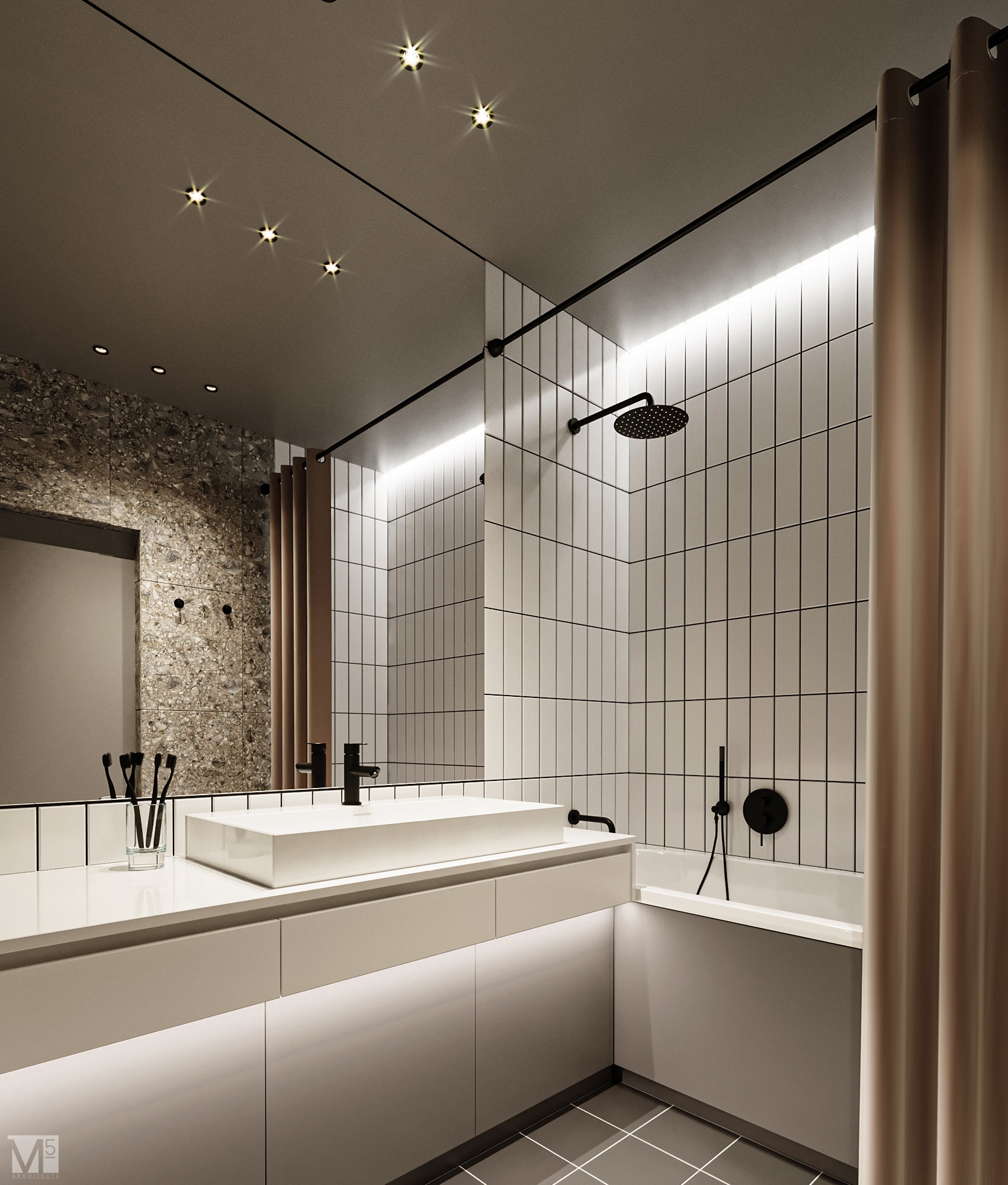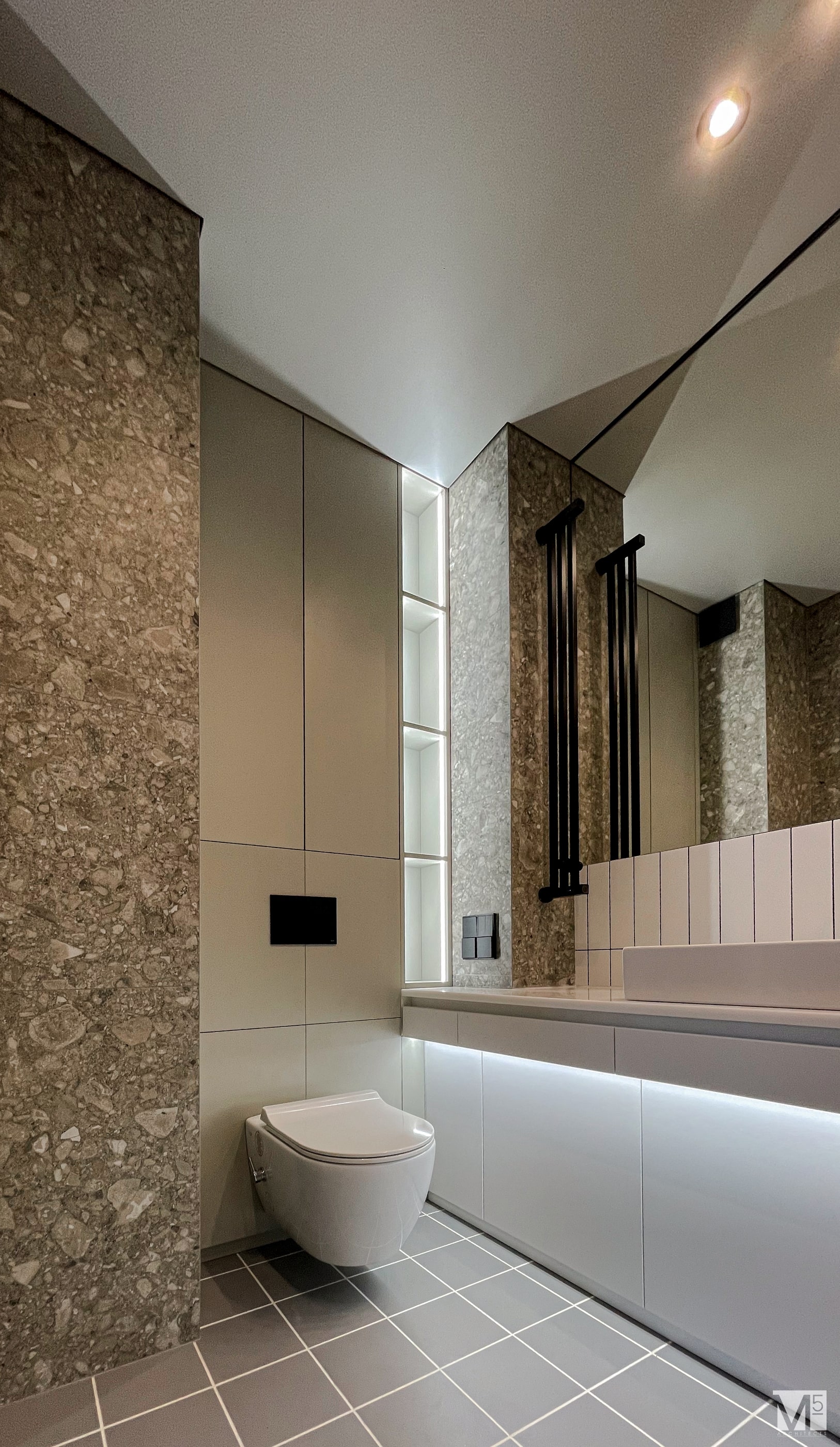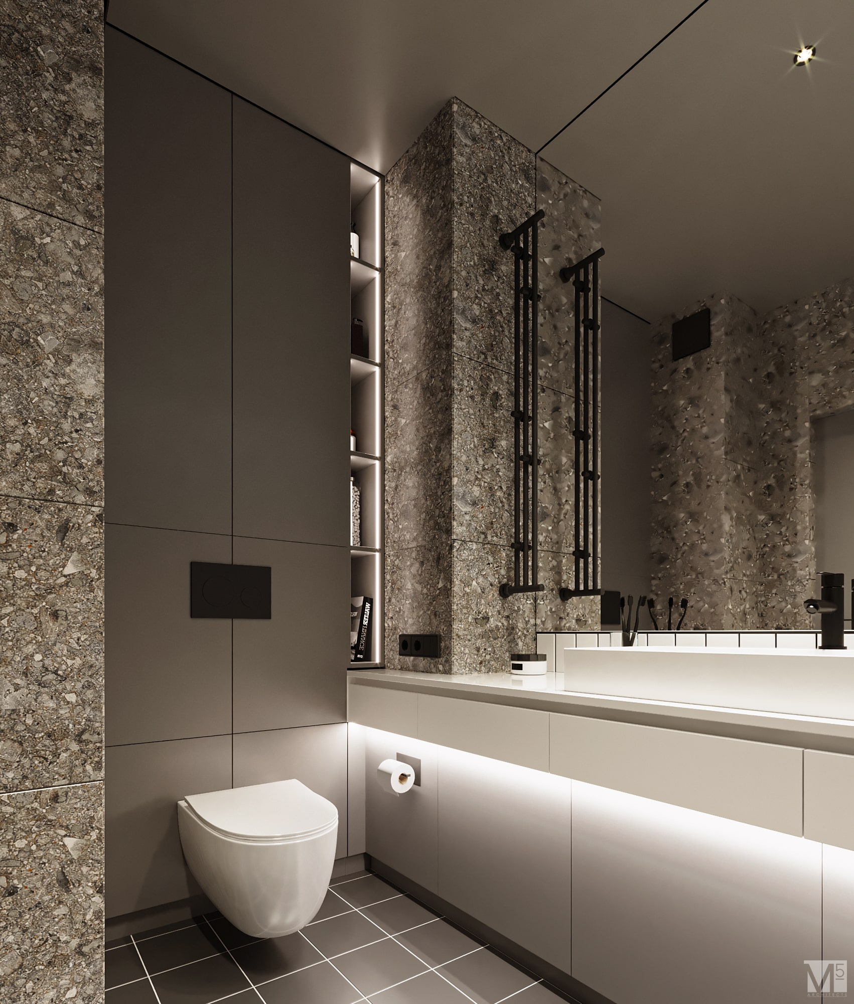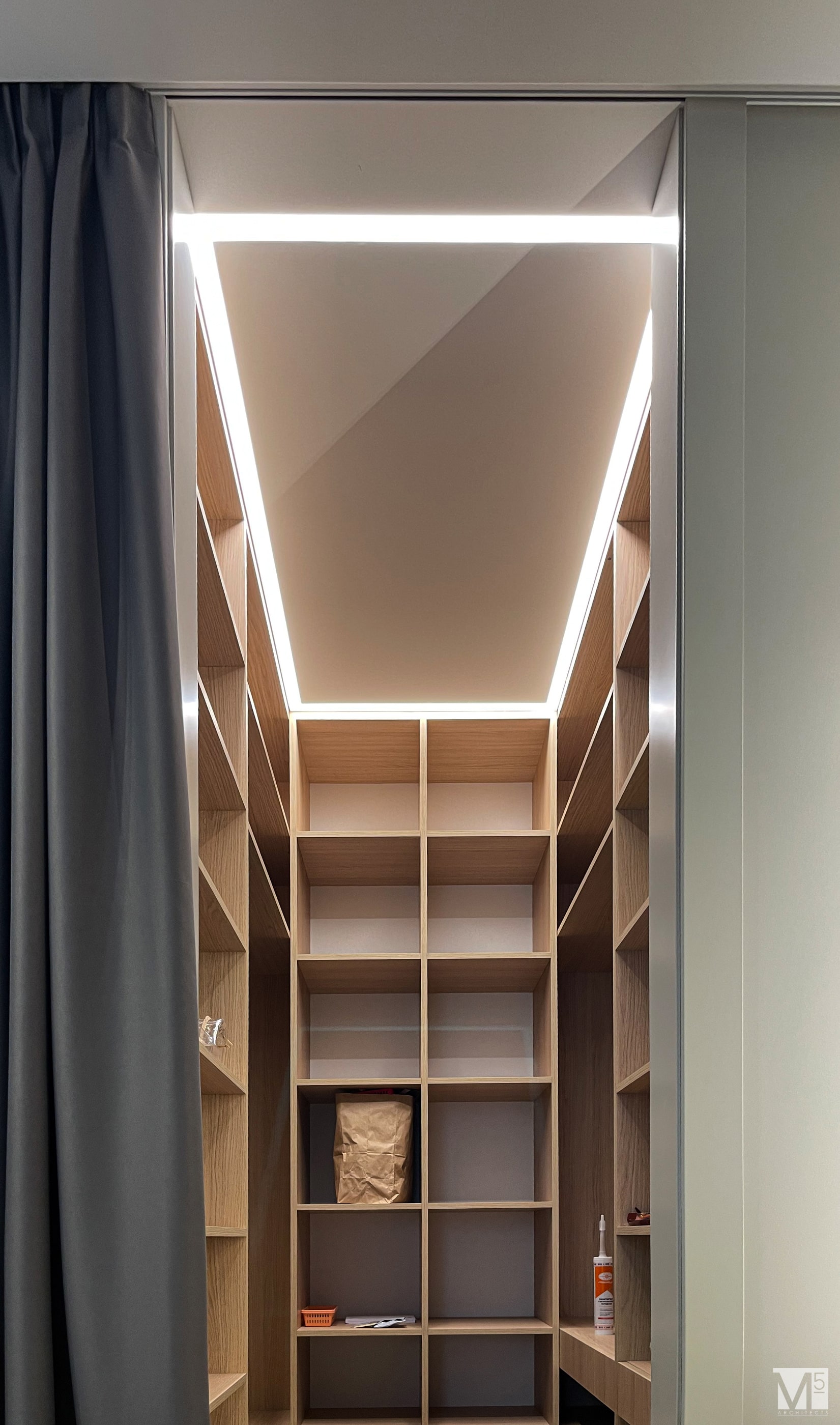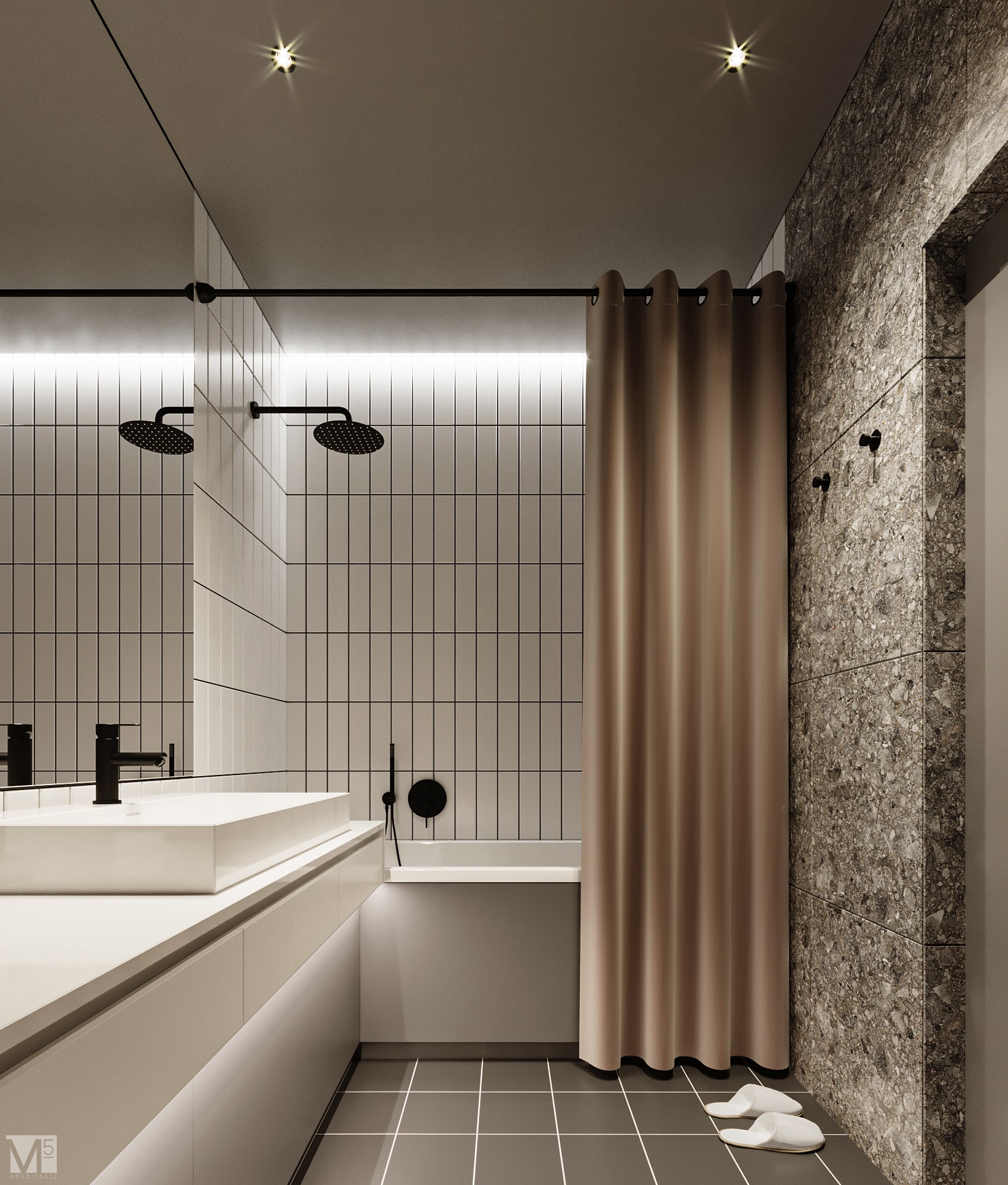 Эта квартира, площадью 62м2, была разработана для молодой пары, которая ценит простор, практичность, строгость и спокойствие. Именно эти ключевые слова и легли в основу этого проекта. Планировочное решение включает в себя: зону коридора, с большим зеркалом и всевозможными местами хранения, потайная постирочная с функцией кладовой, в которой спрятан весь силовой (электрический блок), большая гостиная совмещенная с кухней, спальня с гардеробом и небольшим рабочим местом, расположенным в лоджии. Теплая цветовая гамма обеспечивается приятной, соломенной, текстурой дерева в сочетании с серым и белыми цветами. Общую картину дополняют особые сценарии вечернего освещения, также продуманы места расположения всех электрических точек. Интерьер имеет ряд дизайнерских изюминок, которые акцентирую внимание. Это стеклянные блоки в переходной части из коридора в общую зону. Они же и пропускают свет. А еще были применены акустические панели в зоне ТВ. Это необычный, для квартир, материал имеющий практичное значение в вопросе акустического комфорта, к тому же очень оригинально выглядящий. Изголовье кровати, в спальне, решено из гипсовых 3Д панелей в сочетании с деревянными. В квартире присутствует много текстиля в виде штор, ковров и обивок мягкой мебели. Все выглядит светло, мягко и очень уютно.